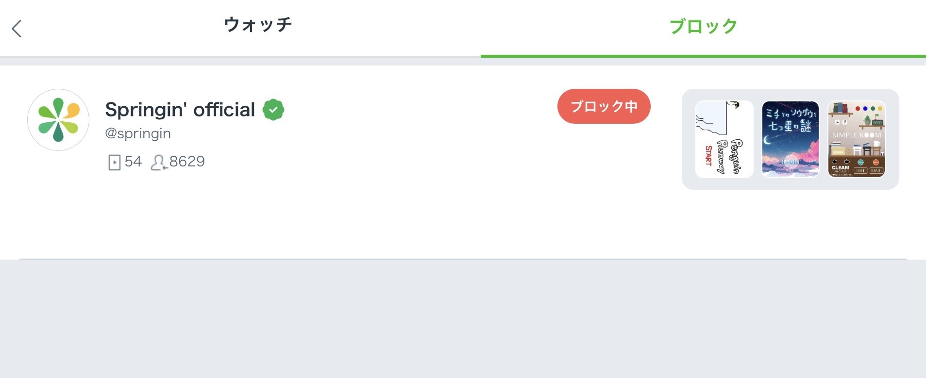 クリエイターページの「ウォッチ」ボタンの下にある「ブロック」ボタンをタップすることで設定できます。